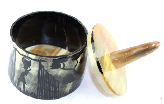 Boîte corne bovine décorée Dimensions (environ) cm : Longueur : Largeur : Hauteur : 6 cm Diamètre : 9 cm Tour/Circonf... REF: 3248-AX-136-AAD