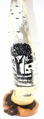 Corne bovine décorée. Dimensions (Environ) : 56 (h) cm . Diamètre 9 x 9 cm